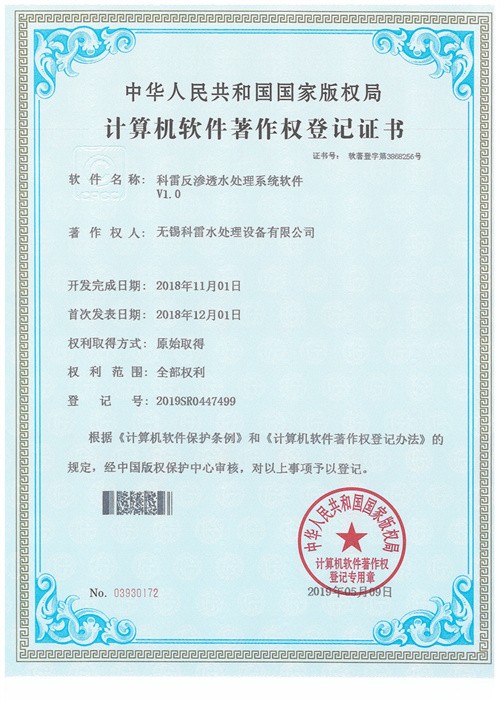 超纯水处理控制系统软著证书 反渗透水处理系统软著证书