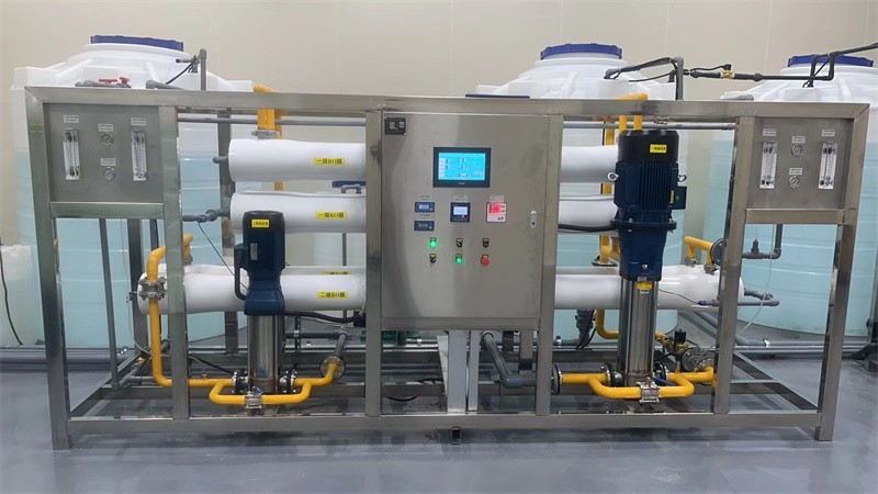 (3)自来水→预处理系统→双级反渗透膜组→RO纯水箱→RO纯水泵→紫色杀菌器→精密过滤器→EDI装置→EDI纯水箱→EDI纯水泵→ 用水点