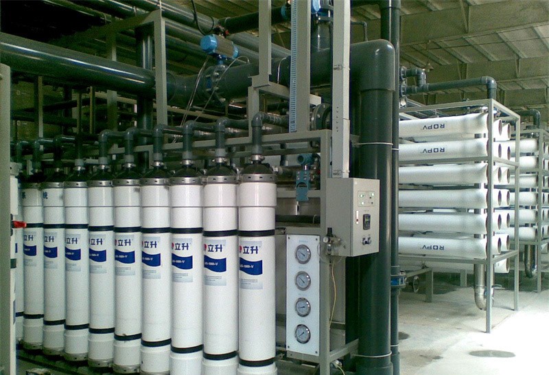 (2)原水箱→原水泵→超滤装置→超滤水箱→双级反渗透膜组→RO纯水箱→RO纯水泵→紫外杀菌器→精密过滤器→EDI装置→EDI氮封水箱→EDI纯水泵→ TOC降解仪→核级抛光混床→微孔过滤器→用水点