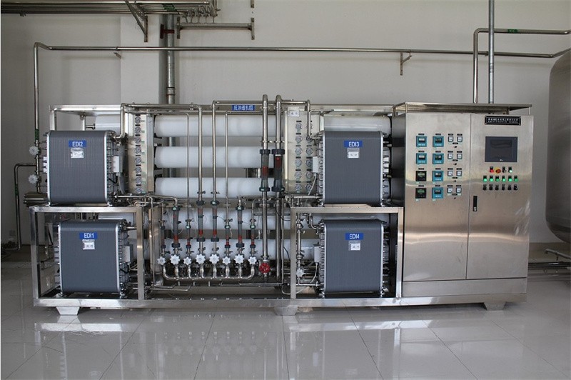 (2)原水箱→原水泵→超滤装置→超滤水箱→双级反渗透膜组→RO纯水箱→RO纯水泵→紫外杀菌器→精密过滤器→EDI装置→EDI氮封水箱→EDI纯水泵→ TOC降解仪→核级抛光混床→微孔过滤器→用水点